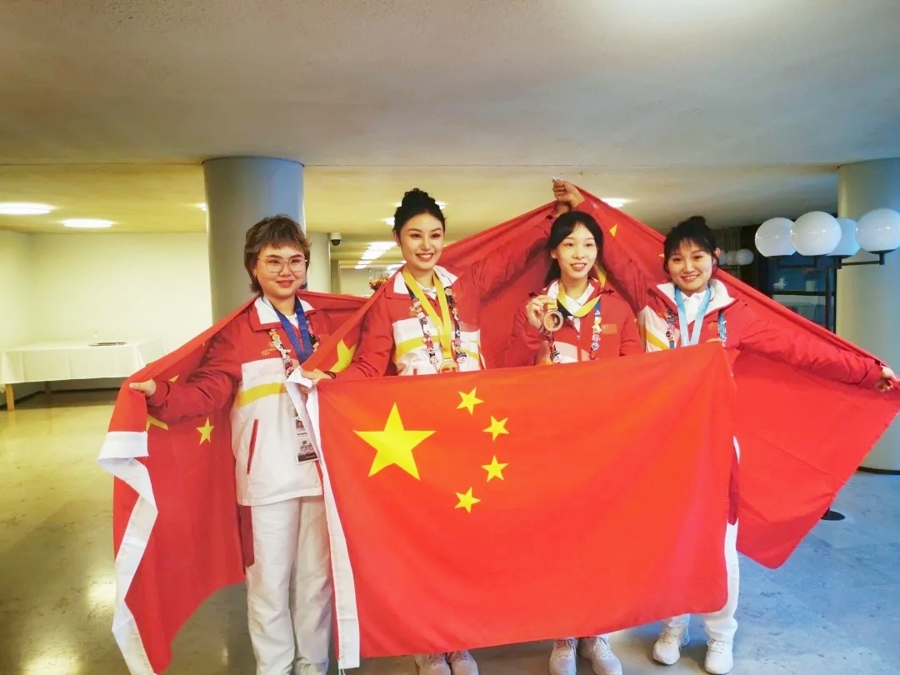 杨灵芝(右一)夺得第46届世界手段大赛花艺方法优厚奖。
